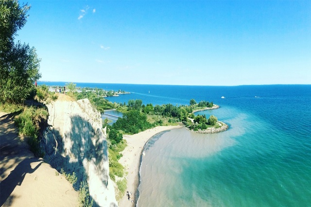 The Scarborough Bluffs also known as The Bluffs, is an escarpment in the Scarborough district of Toronto, Ontario, Canada. There are nine parks along the bluffs, with Bluffers Park being the only one with a beach. These parks feature spectacular views of the bluffs and Lake Ontario, trails, beaches, gardens, sports and recreation facilities. For those
